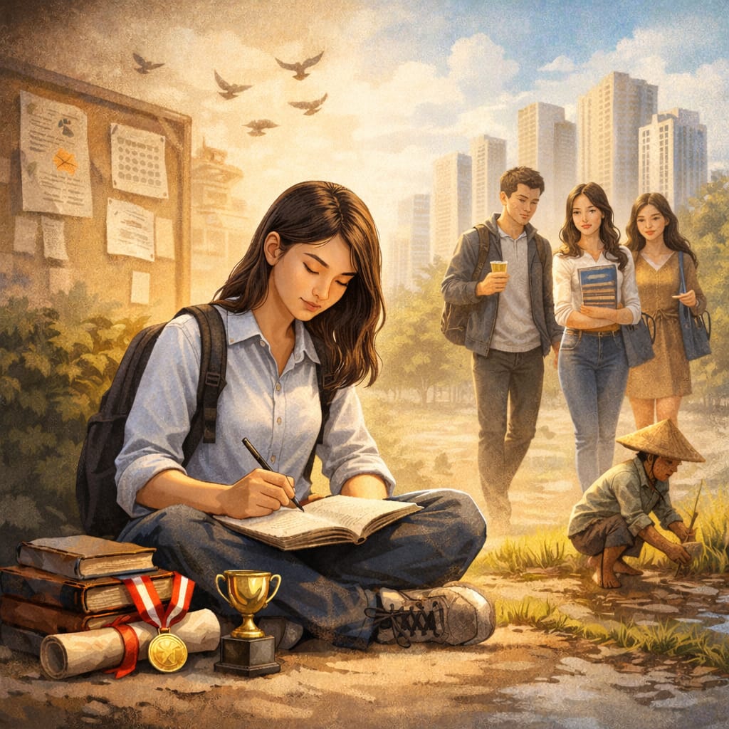 Dalam menjalani perkuliahan,aku selalu berusaha bersungguh-sungguh.Kesungguhan itu tidak hanya kutaruh pada bangku kelas dan materi akademik, tetapi juga kehidupan sosial.Aku aktif berorganisasi, mengikuti berbagai perlombaan, dan terus berusaha mengembangkan diri.Semua itu bukan semata demi prestasi, melainkan sebagai bentuk ikhtiar agar ilmu yang kupelajari tidak berhenti di ruang teori,